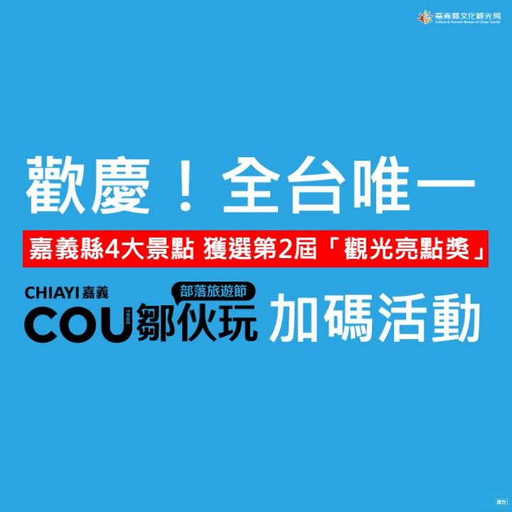 尹遵/嘉義報導 交通部觀光署日前公布第二屆「觀光亮點獎」,嘉義縣表現亮眼,共有4處景點獲獎。在「觀光亮點獎」評選中