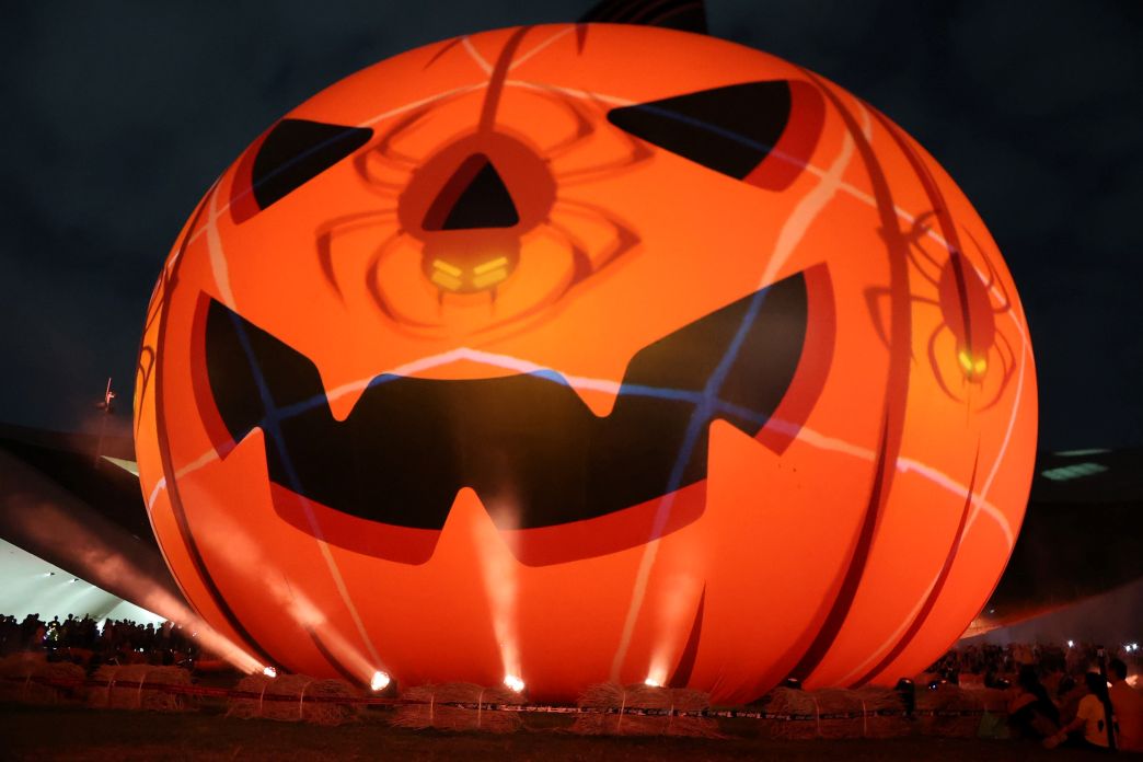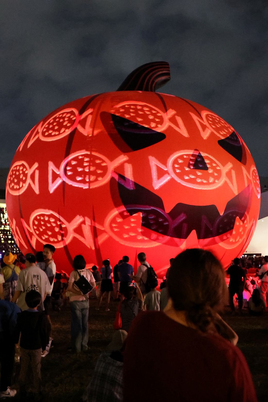 許多民眾攜家帶眷前來觀賞,不少全家裝扮成萬聖節氛圍,戴著南瓜帽、拿著螢光棒,隨著燈光節奏跳動、歡笑不斷;家長們則忍不住舉起手機,拍下巨型南瓜在夜空閃耀的絢爛畫面。還有家庭一起合影留念,笑聲與光影交織出充滿節慶氣氛的夜晚。