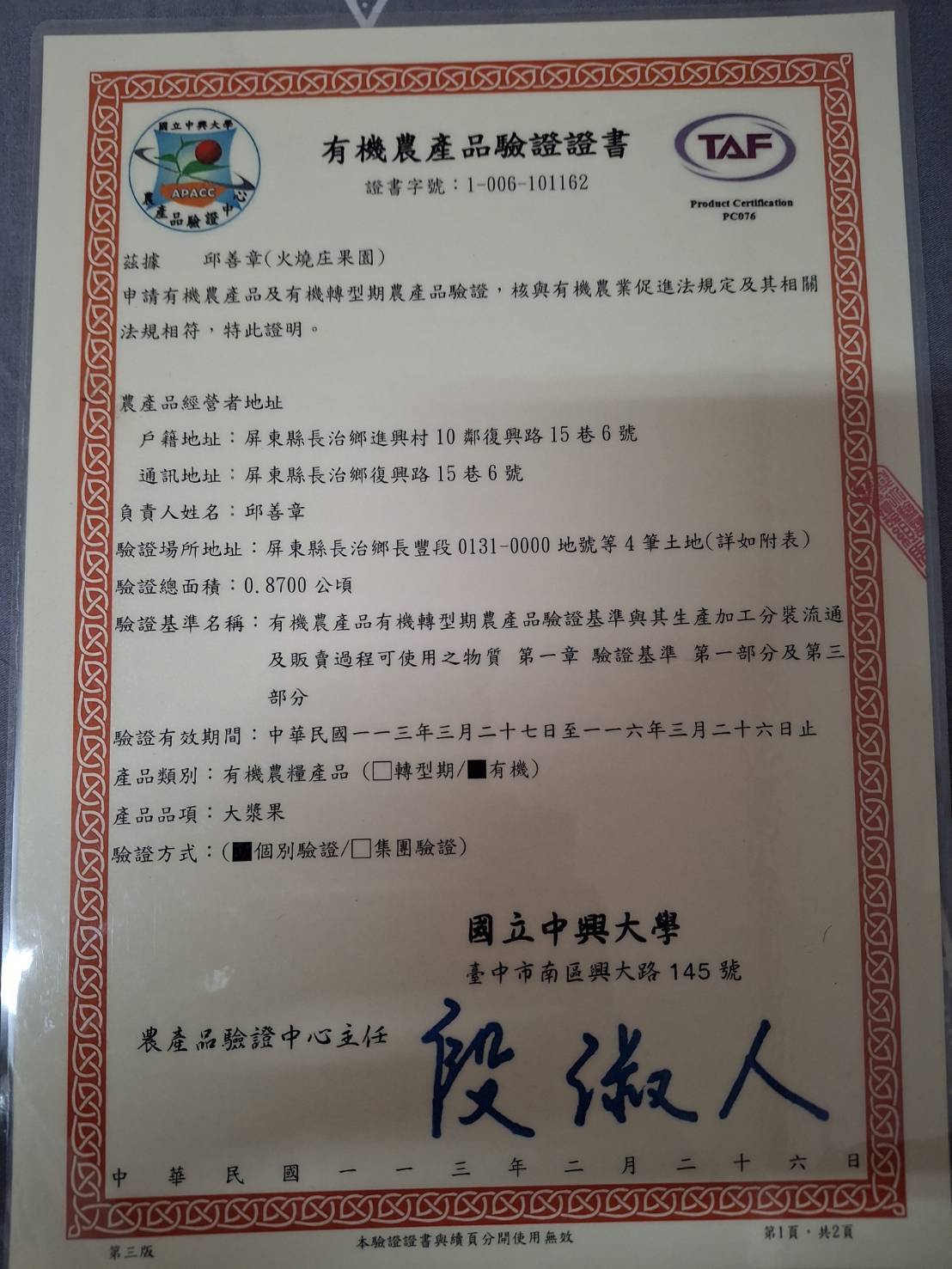 認證:有機農產品驗證 (證書字號 1-006-101162)